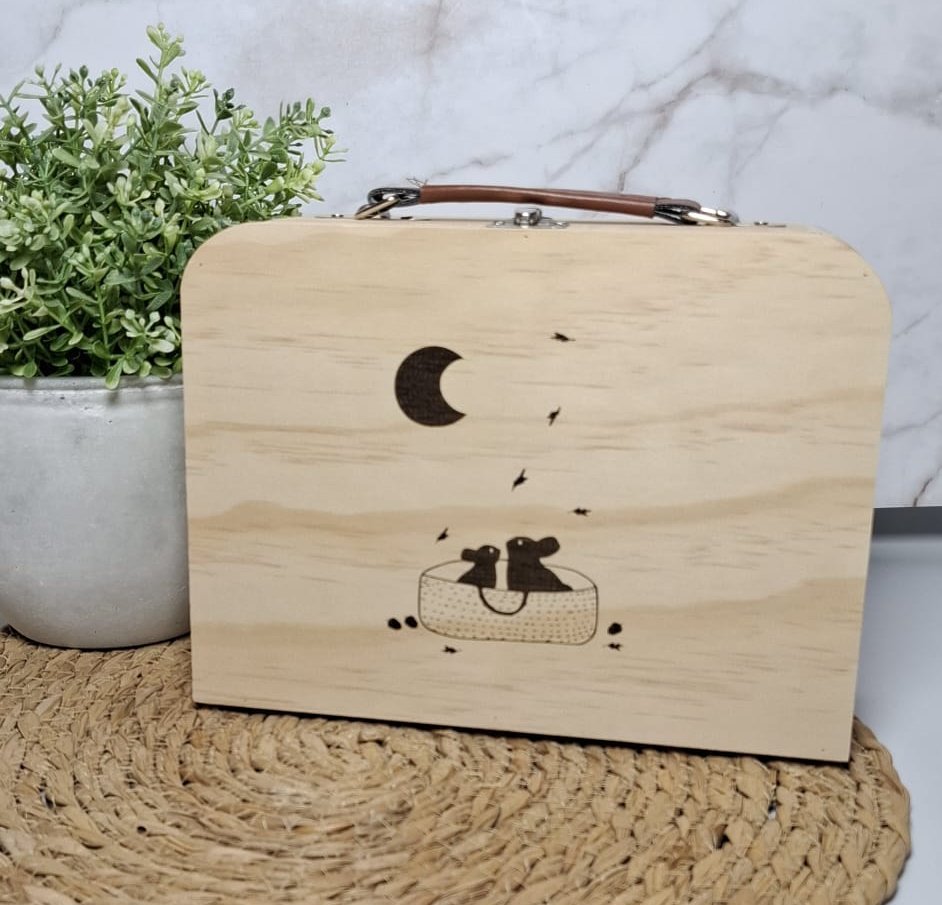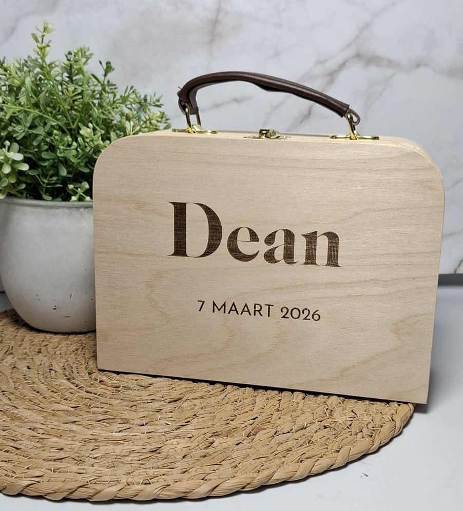 Een uniek koffertje, geïnspireerd op het geboortekaartje of geheel naar eigen wens. Je kan hier de eerste babykleertjes in bewaren of alle mooie ontvangen kaarten. Het is zelfs leuk om mee te spelen.