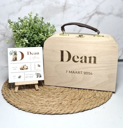 Een uniek koffertje, geïnspireerd op het geboortekaartje of geheel naar eigen wens. Je kan hier de eerste babykleertjes in bewaren of alle mooie ontvangen kaarten. Het is zelfs leuk om mee te spelen.