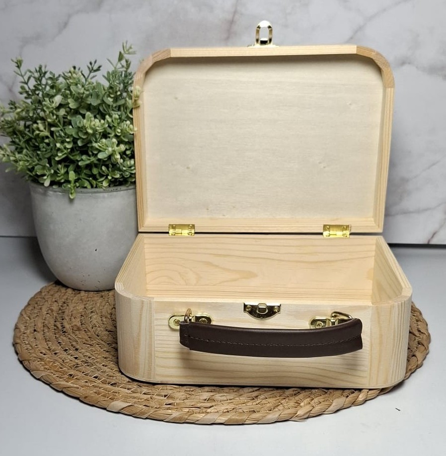 Je kan hier de eerste babykleertjes in bewaren of alle mooie ontvangen kaarten. Het is zelfs leuk om mee te spelen. De koffertjes zijn gemaakt van hout. Het handvat en sluiting zijn van metaal net zoals het randje aan de deksel en binnenkant voor extra duurzaamheid. De afmeting is 23x15x9 cm