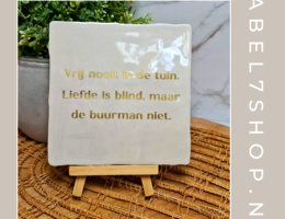 Tegeltje 'Vrij nooit in de tuin, liefde is blind, maar de buurman niet.'